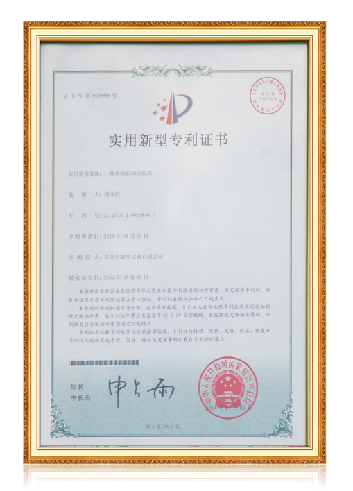 五軸點膠機專利證書