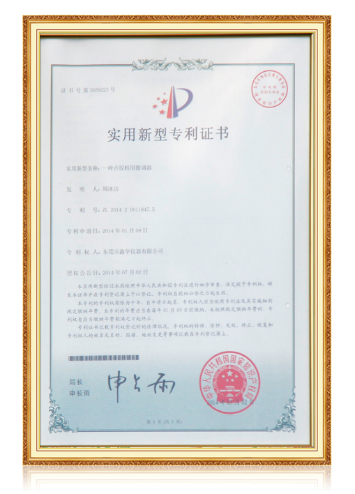 點膠機用微調(diào)器證書